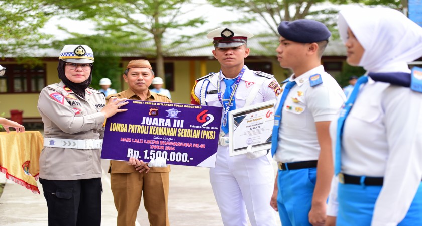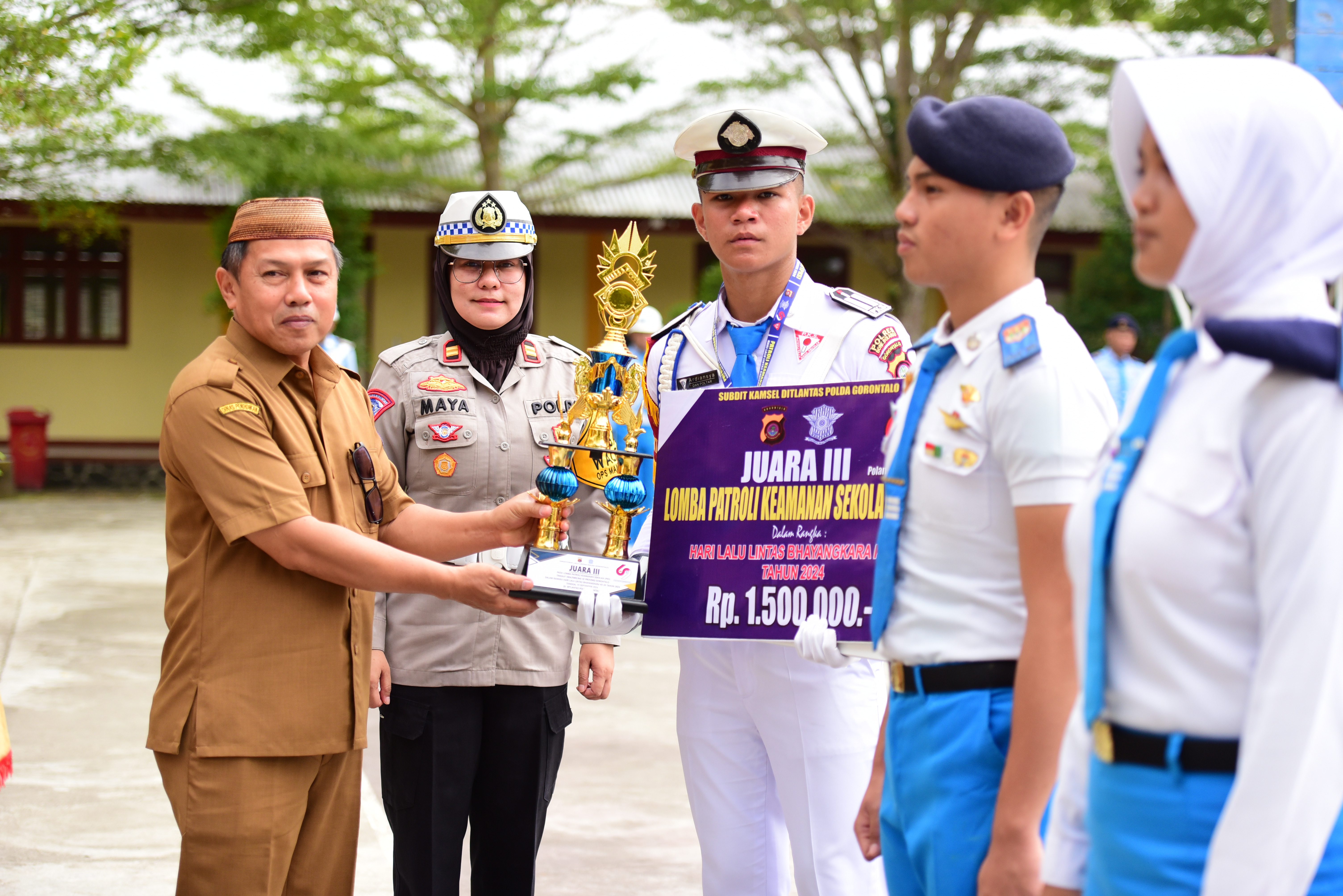 BERTINDAK SELAKU INPEKTUR UPACARA KASATLANTAS BONE BOLANGO SERAHKAN SIMBOLIS PIALA KEJUARAAN PKS TINGKAT POLDA GORONTALO 2024