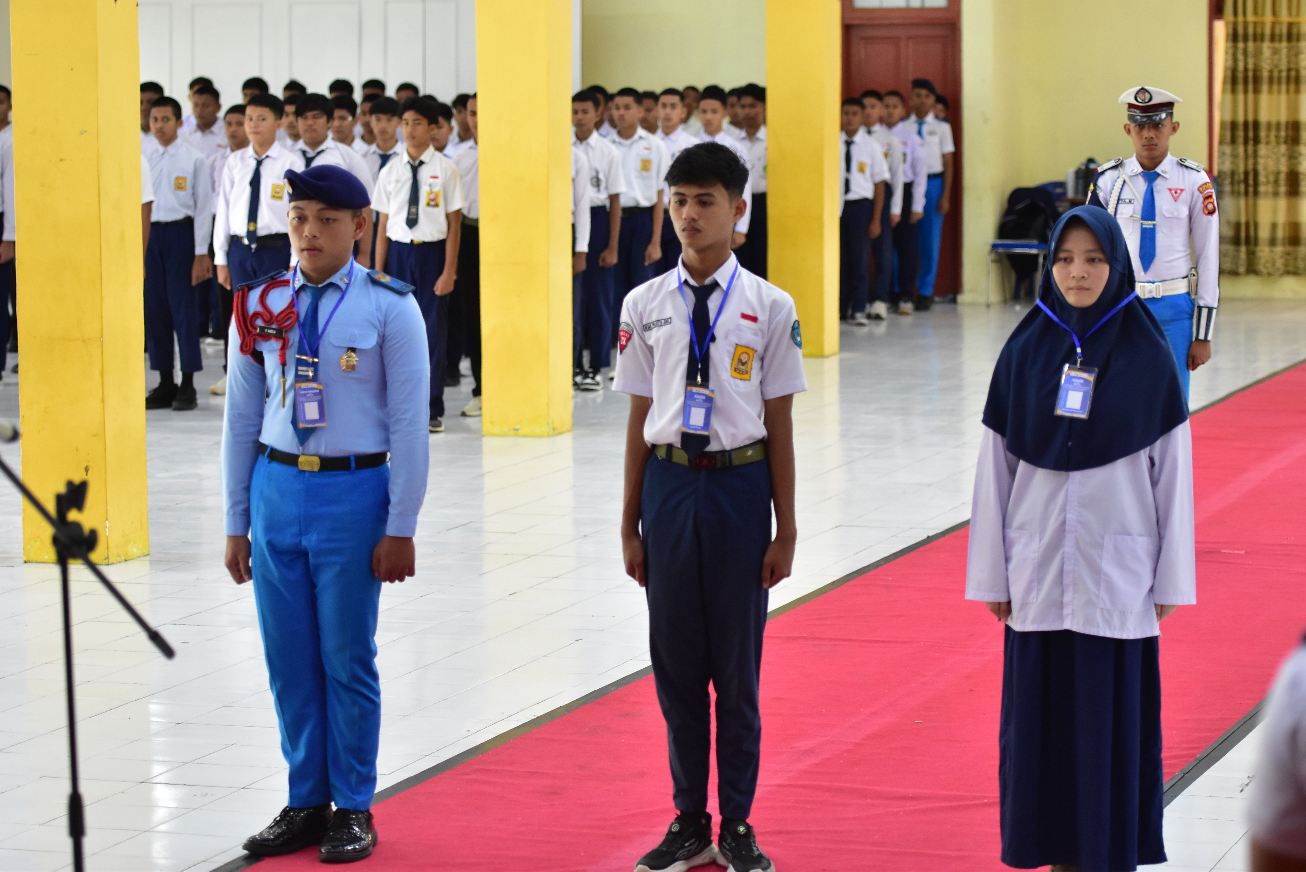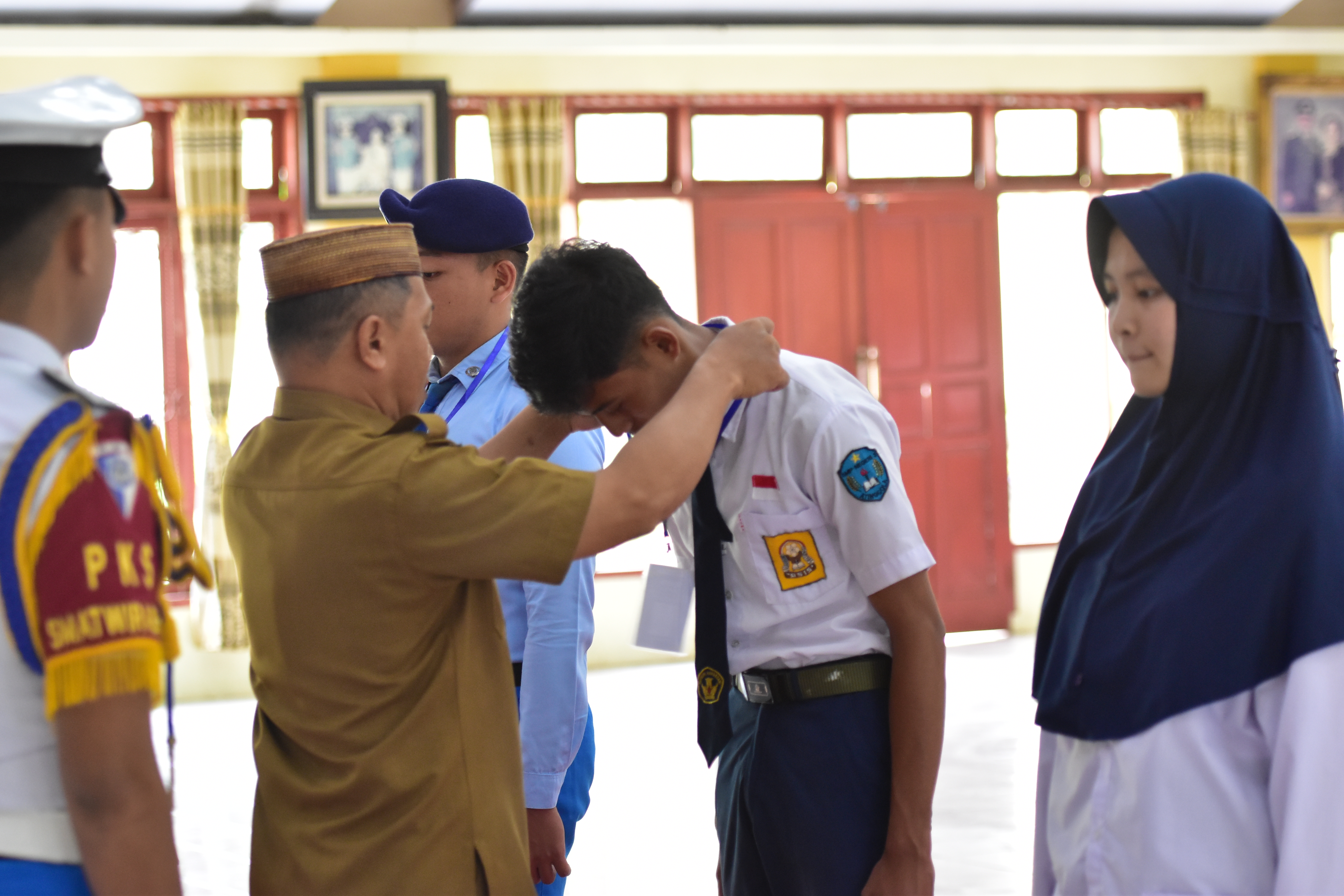 dalam kesempatan ini kepala SMAS Terpadu Wira Bhakti juga menyematkan tanda Peserta dan panitia ,yang diwakili oleh Taruna Wira Fatahila Akolo (panitia) dan peserta yakni Revan Prasetya Gobel (CATAR) Nifa Febrina Mokolintad (CATARI)